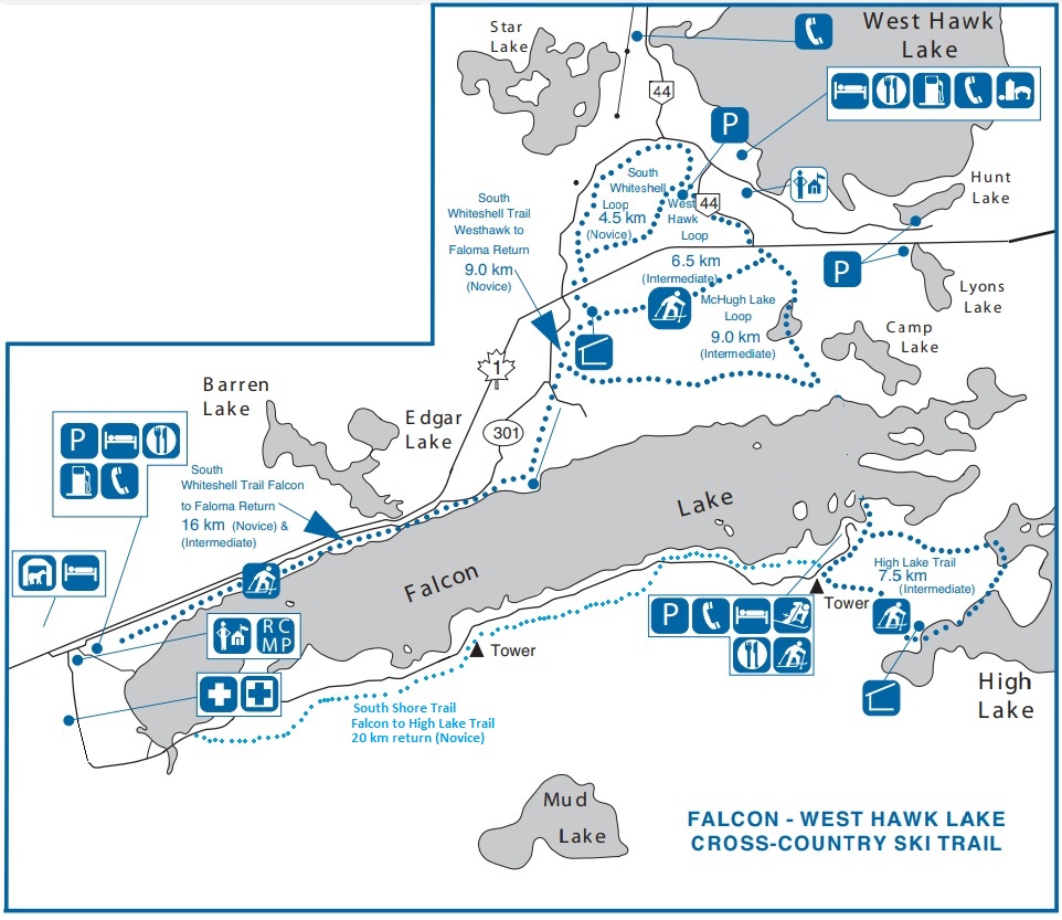Part of the Trans Canada Trail, this extensive route links West Hawk Lake to Falcon Lake townsite and the Falcon Ridge Ski Area. Single-track classic skiing offers gently rolling sections, twisty forest paths, lake crossings, and some technical uphills and downhills. There is one spot where the trail crosses a road while descending a hill; please use caution here. Follow South Whiteshell Trail Association’s Facebook or Instagram for winter updates.